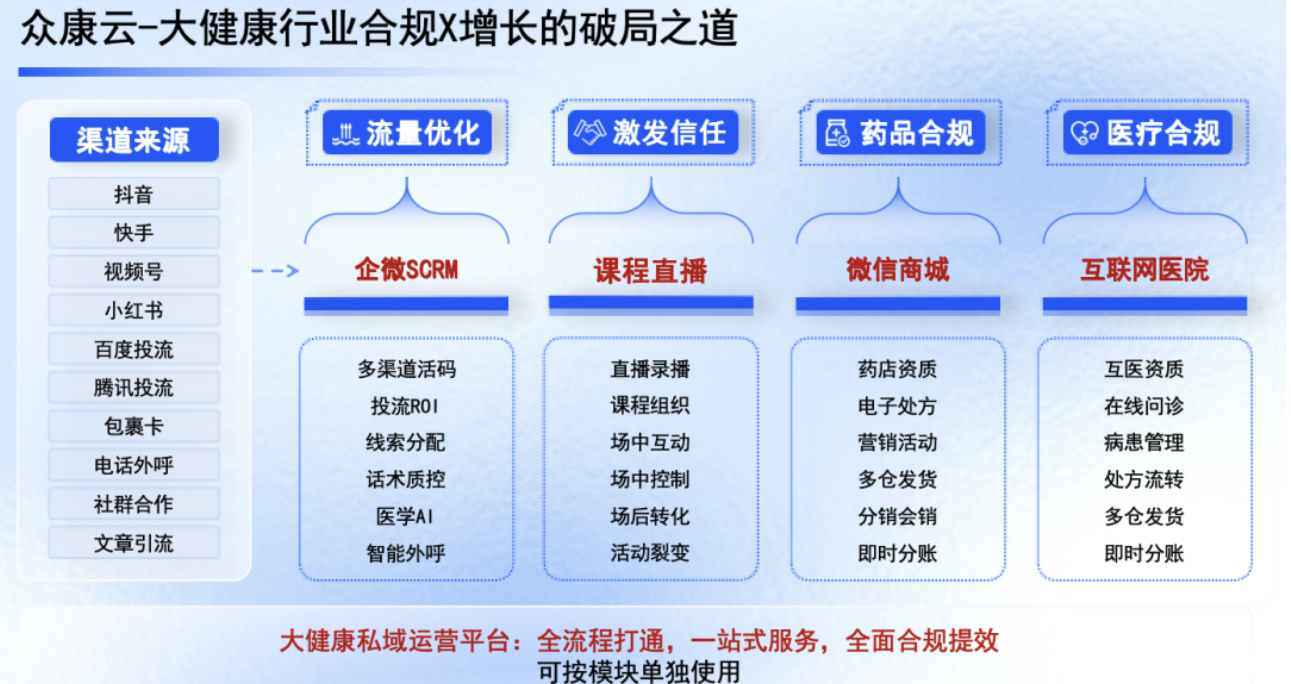 - 解决方案:众康云4合1大健康私域平台,实现合规经营与用户增长双重目标