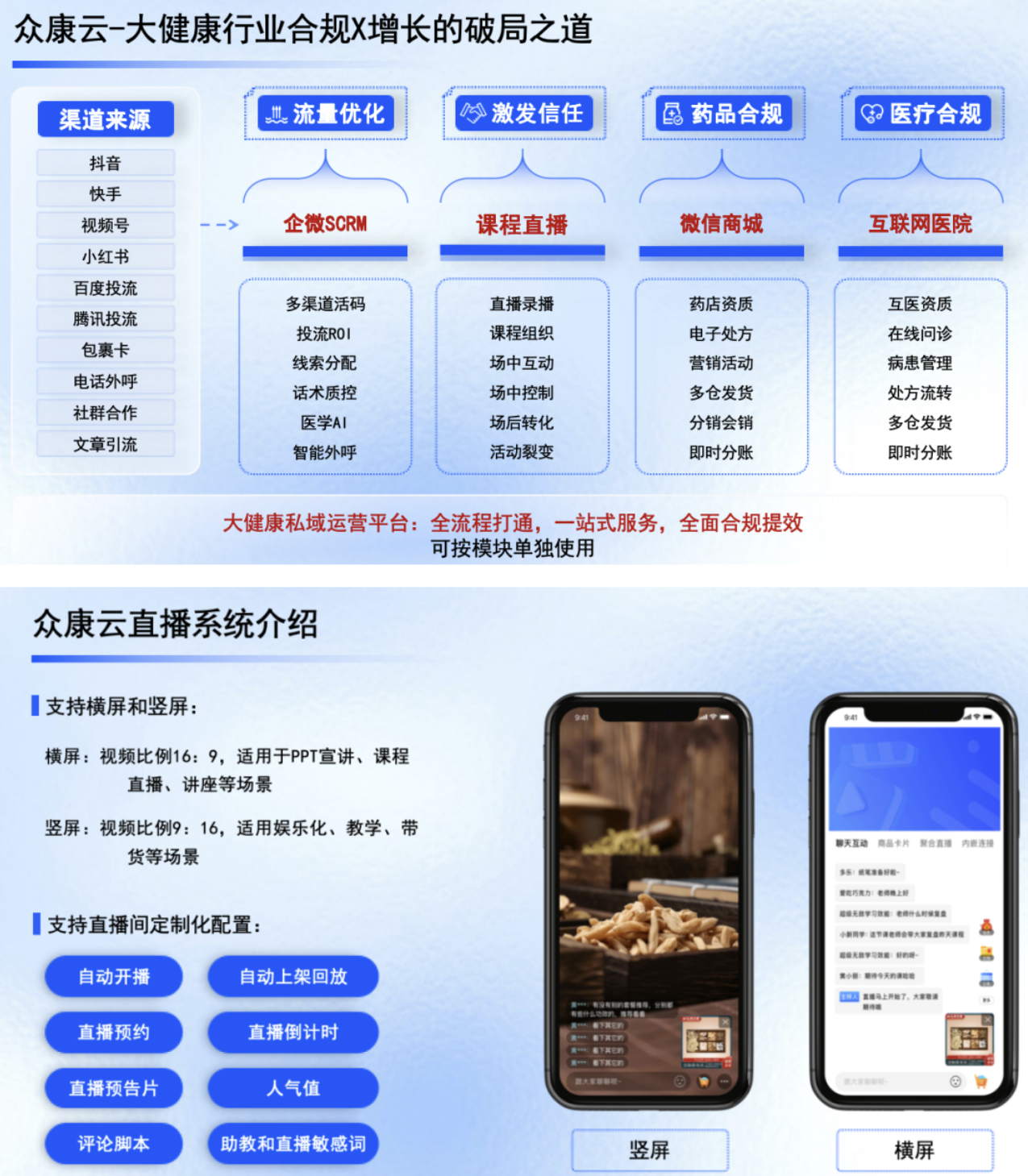 - 系统集成:集成直播/栏目、互联网医院、微信商城、企微SCRM四大功能,实现私域流量的沉淀、信任、转化和合规。