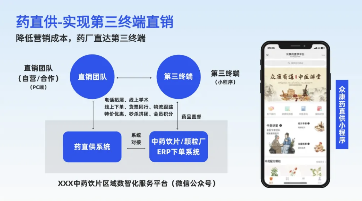 以药厂为中心搭建数字化直销平台,第三终端在线开户、下单、支付、查物流,精准营销降低推广成本。