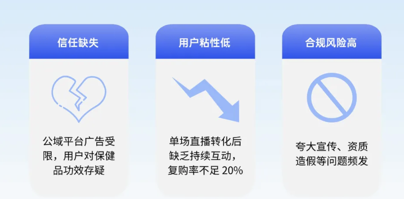 公域平台对医疗健康广告存在严格限制,用户对保健品功效存疑。