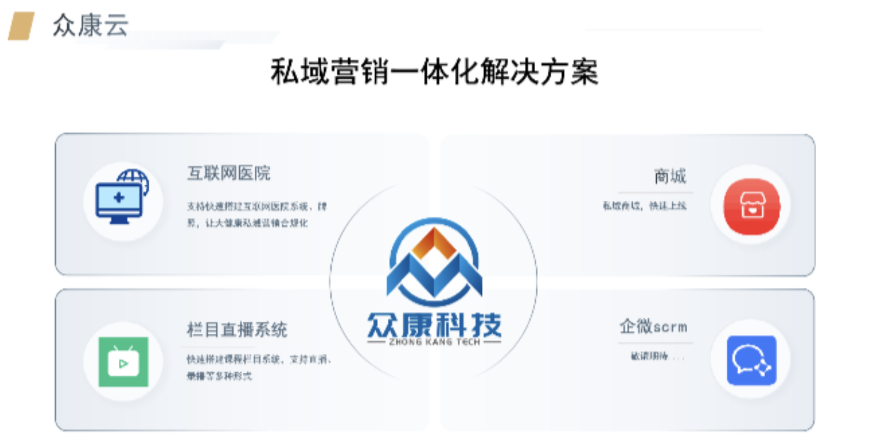 众康科技首创大健康4合1运营系统,通过栏目直播系统、互联网医院牌照和系统、药品交易资质和微信商城系统、企微SCRM的结合,为健康私域直播企业提供一站式合规运营解决方案,帮助企业实现合规运营与高效转化。