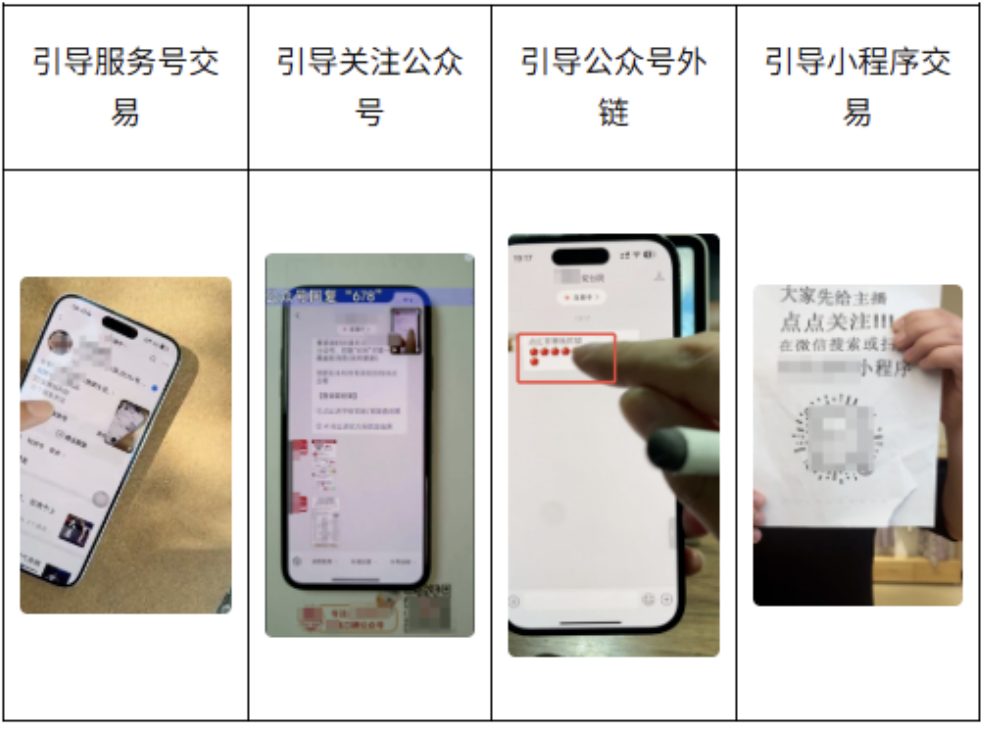 新增“跨橱窗导流”“社群导流”“线下承接”等违规情形。三类禁止行为包括展示第三方平台Logo、暗示用户去其他平台搜索;引导服务号/公众号/小程序交易;口播“去我另一个直播间下单”等。