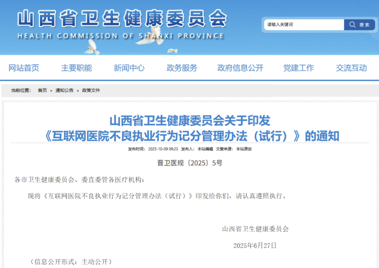 随着“互联网+医疗健康”行业的快速发展,互联网医院的数量和规模不断扩大,但同时也暴露出一系列执业行为不规范的问题。为了加强对互联网医院的监管,山西省卫生健康委员会近期发布了《互联网医院不良执业行为记分管理办法(试行)》,创新性地引入“驾照式”记分管理制度,为互联网医院的合规运营设立了明确的标尺。