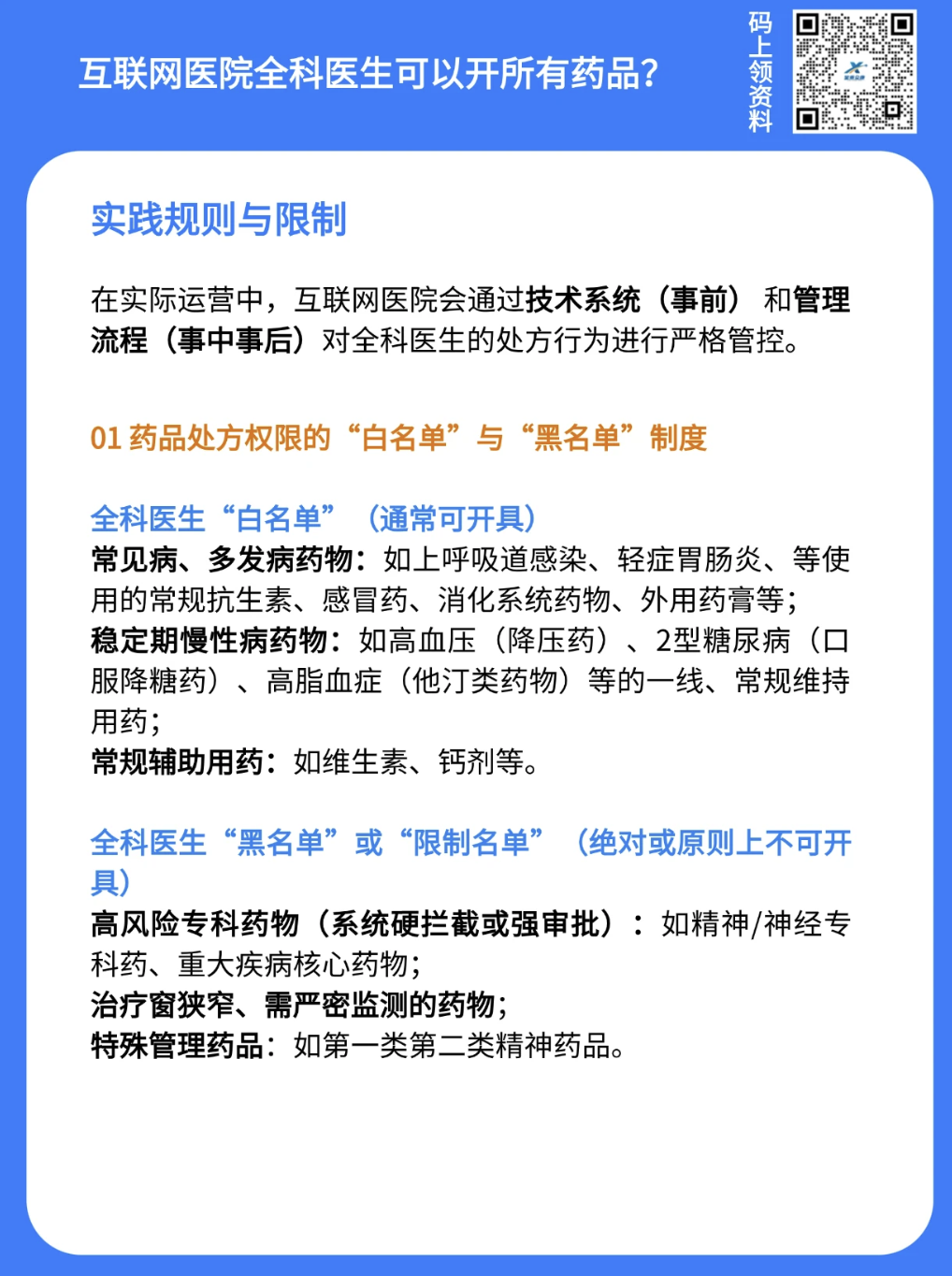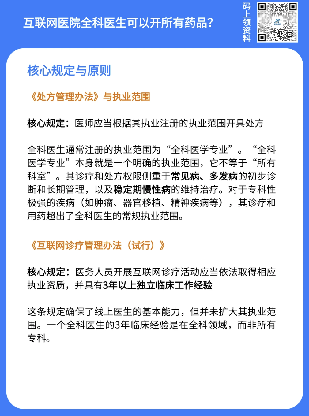 - 互联网诊疗资质门槛清晰:开展互联网诊疗需具备3年以上独立临床工作经验,资质审核是合规前提。