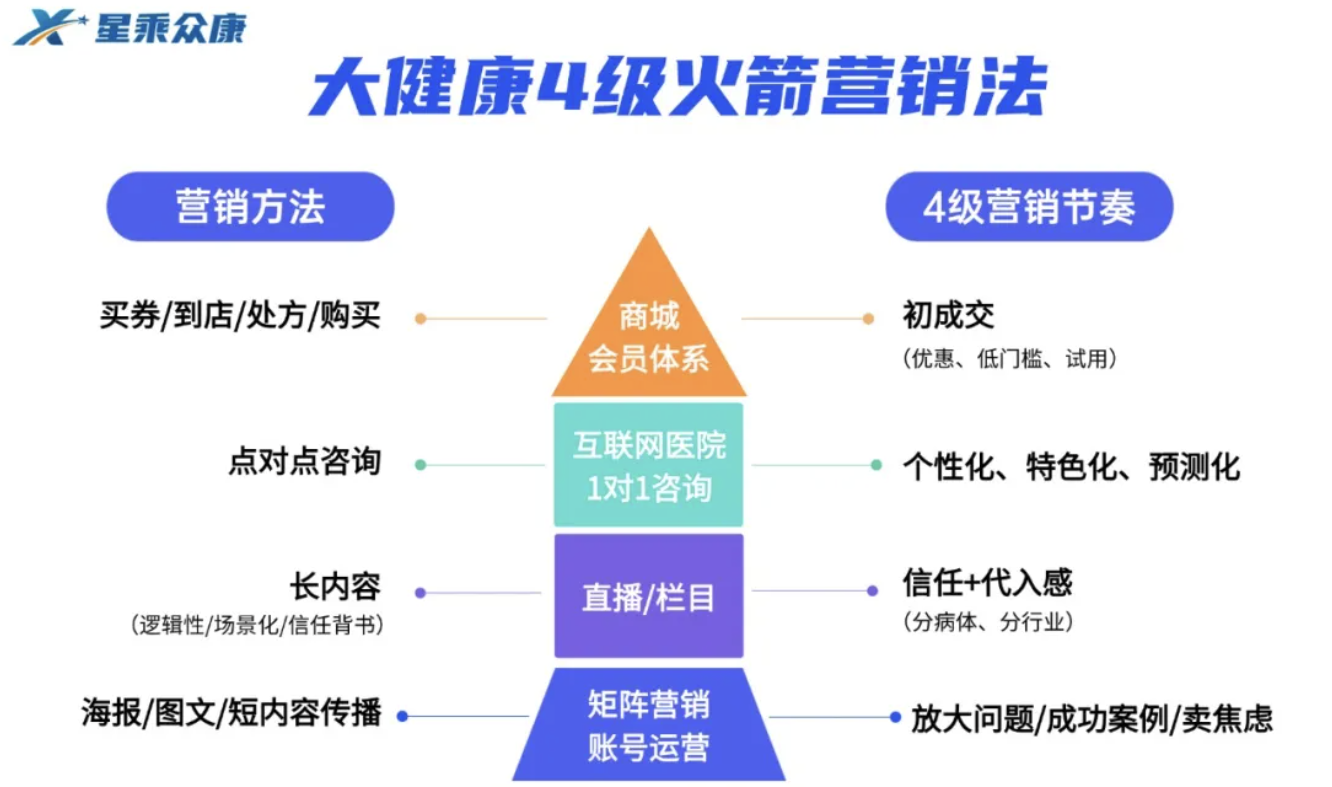 星乘众康独创的“大健康4级火箭营销法”,是一套针对中医馆私域运营的内容营销打法。该营销法通过精准洞察用户需求,提供个性化的服务与优惠信息,激活沉睡私域用户,提高中医馆的客户转化率与复购率。